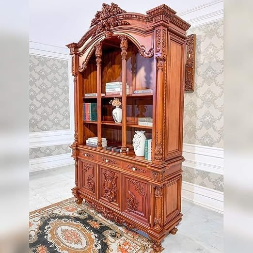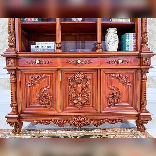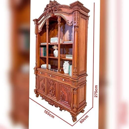 Muskan arts solid teak wooden handcarved storage cabinet. This beautifully crafted cabinet is made from premium solid teak wood and features intricate handcarved details that add a touch of luxury to any space. Designed for versatility, it functions perfectly as a crockery cabinet, storage unit, or display piece, making it an ideal addition to your living room, kitchen, bedroom, or dining area. With 3 doors, 3 drawers, and 9 open storage shelves, this cabinet offers ample storage space for your crockery, linens, decorative items, and more. The rich, natural finish highlights the beauty of the wood grain, ensuring that this piece not only serves a practical purpose but also enhances the aesthetic of your home.
